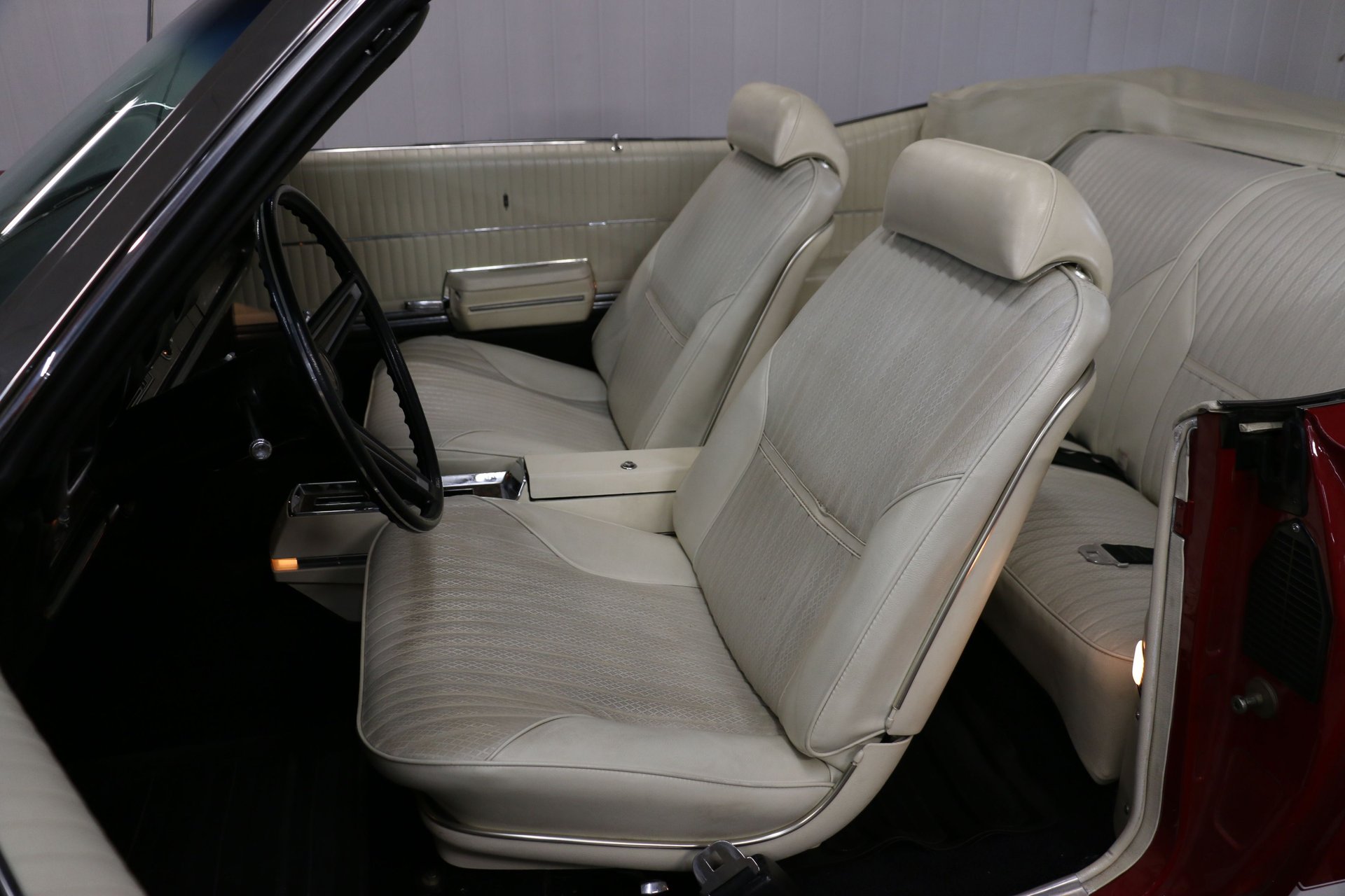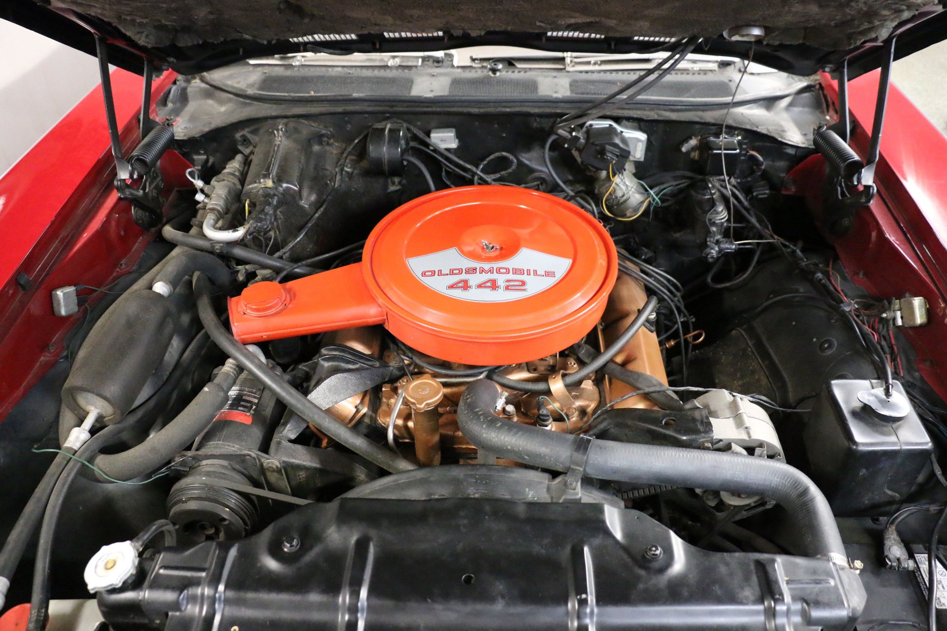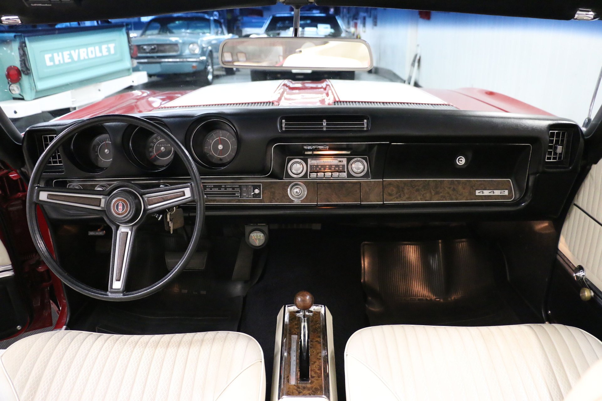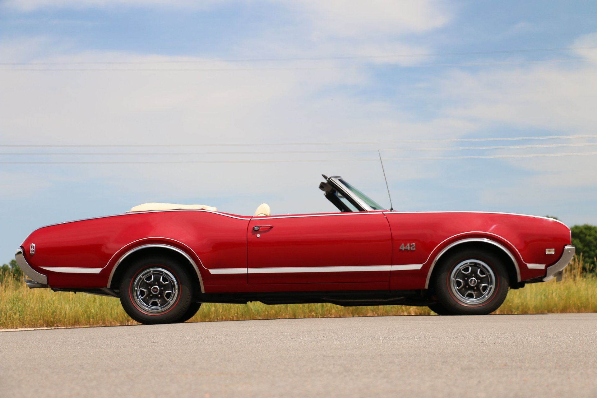 Here is a beautiful and true 1969 Oldsmobile 442 convertible. Nice Crimson Red paint with brand new white top with white and black interior. The engine has been upgraded to a 455 Big Block paired to the original matching TH400 automatic and 12 bolt rear end. Equipped with factory air conditioning, power steering and power top. Super clean interior with bucket seats, center console and AM/FM radio.