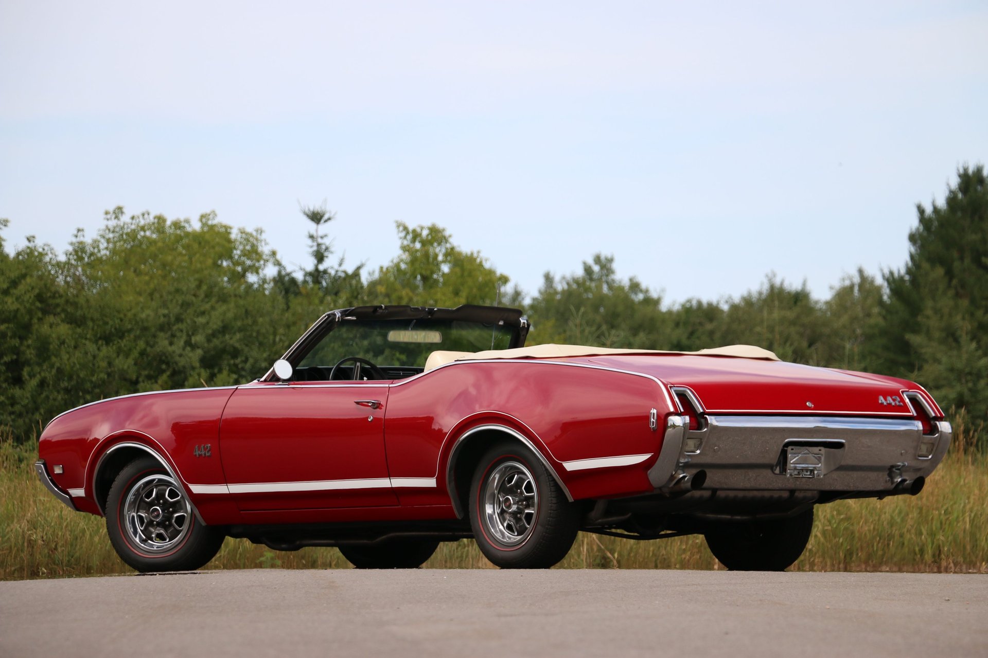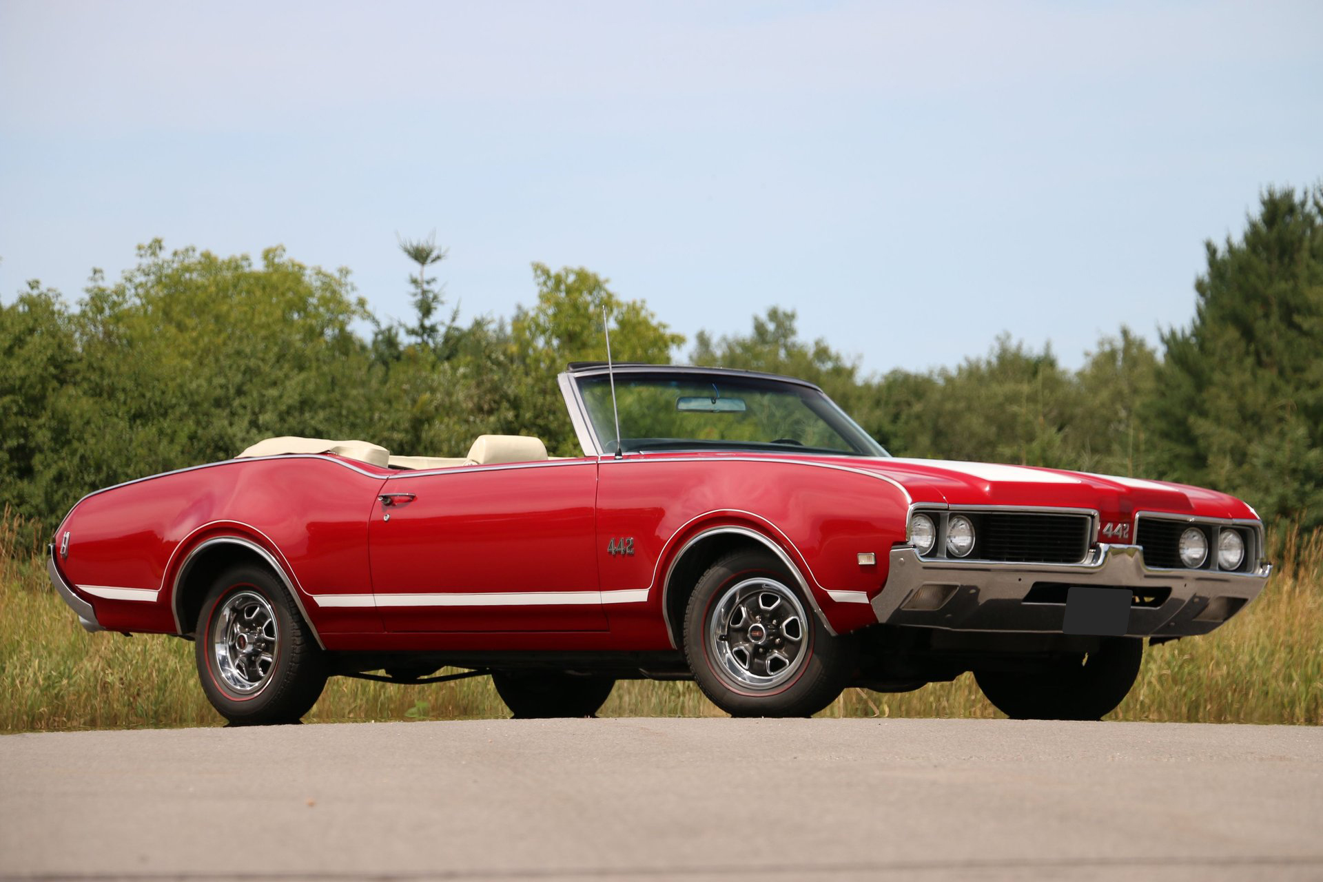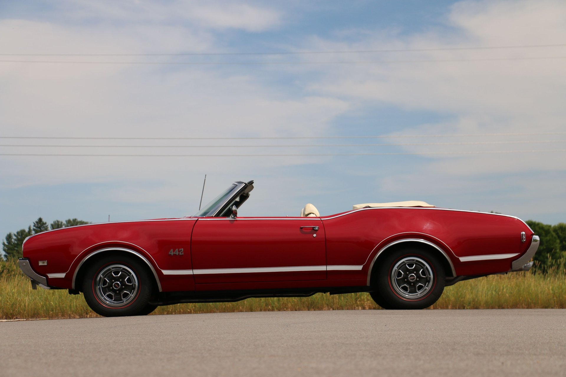 Here is a beautiful and true 1969 Oldsmobile 442 convertible. Nice Crimson Red paint with brand new white top with white and black interior. The engine has been upgraded to a 455 Big Block paired to the original matching TH400 automatic and 12 bolt rear end. Equipped with factory air conditioning, power steering and power top. Super clean interior with bucket seats, center console and AM/FM radio.