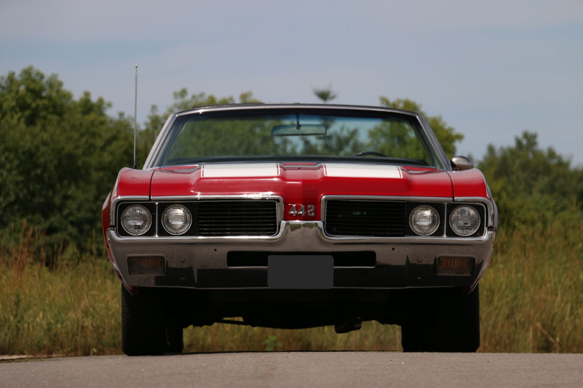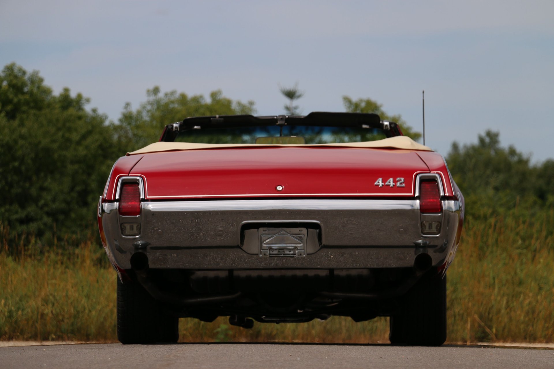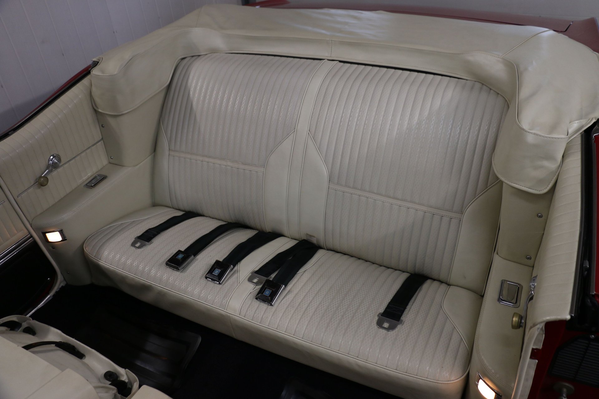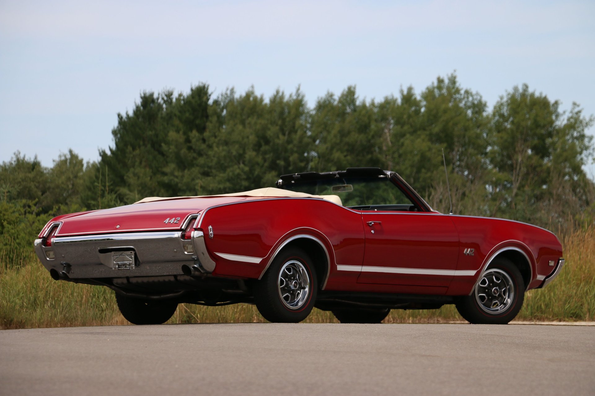 Here is a beautiful and true 1969 Oldsmobile 442 convertible. Nice Crimson Red paint with brand new white top with white and black interior. The engine has been upgraded to a 455 Big Block paired to the original matching TH400 automatic and 12 bolt rear end. Equipped with factory air conditioning, power steering and power top. Super clean interior with bucket seats, center console and AM/FM radio.